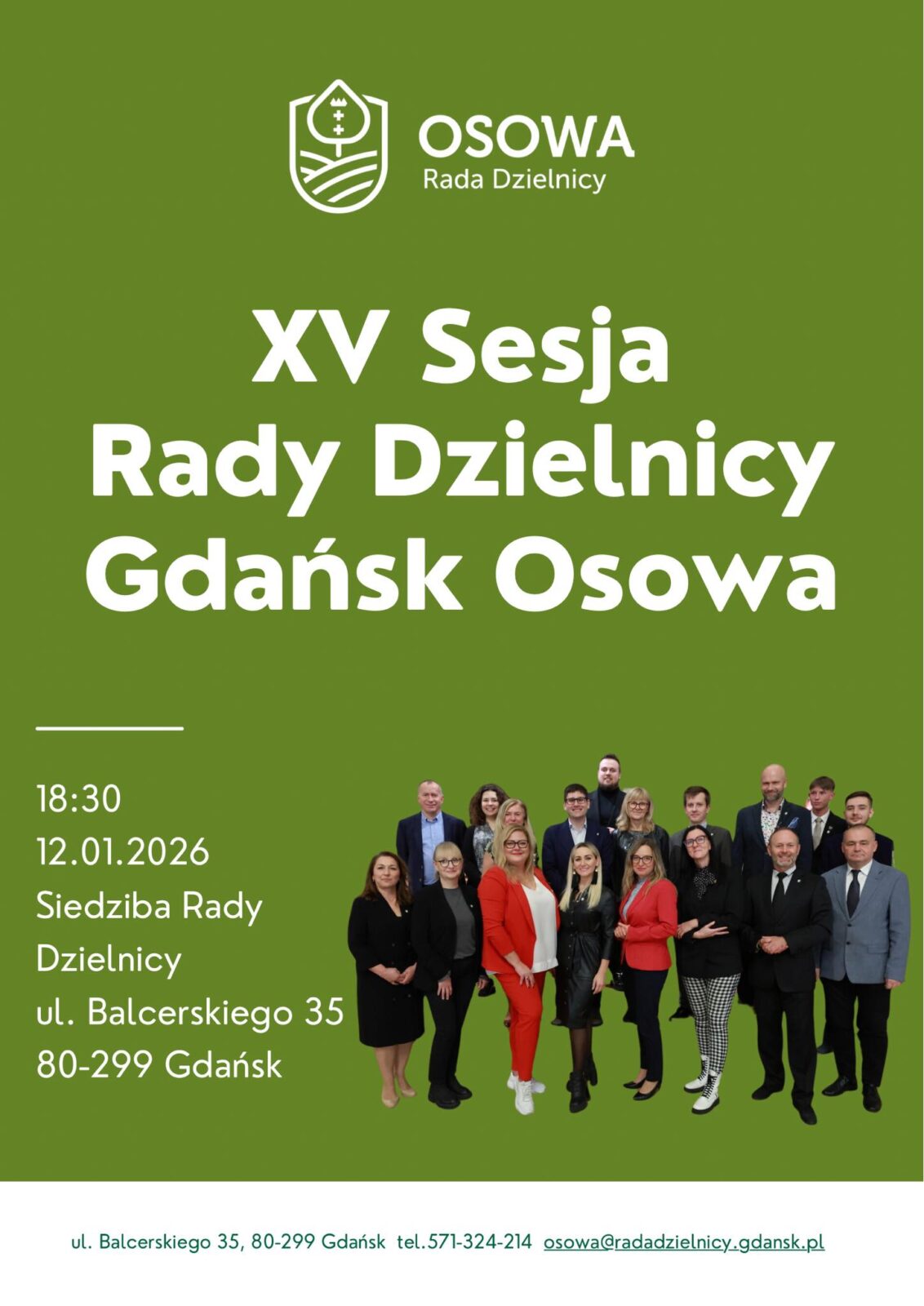 zapraszamy Państwa serdecznie na XV sesję Rady Dzielnicy Osowa, która odbędzie się w najbliższy poniedziałek, 12 stycznia 2026 r., od godz. 18:30 w trybie stacjonarnym (w naszej siedzibie przy ul. Balcerskiego 35).