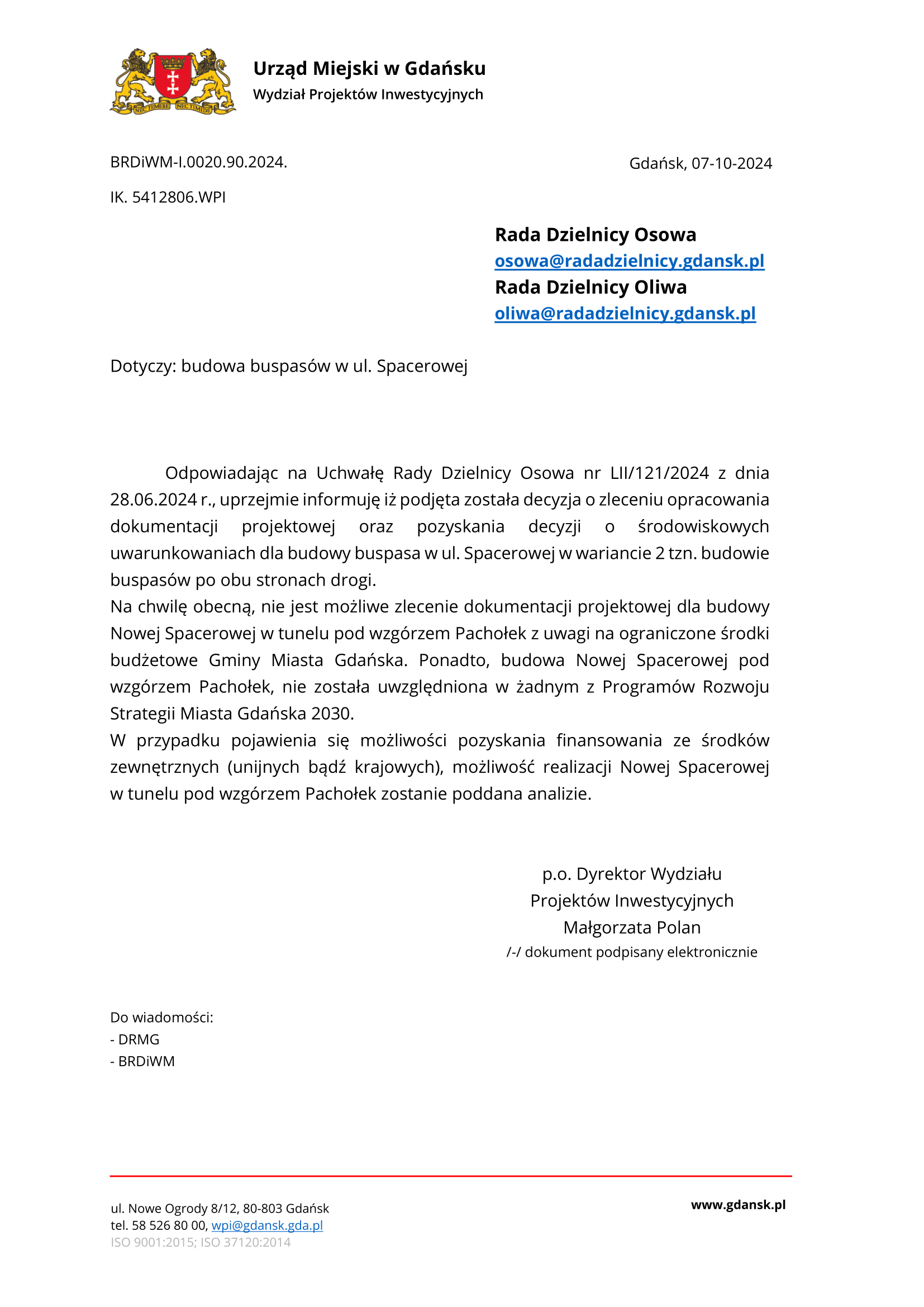 W odpowiedzi na uchwałę Rady Dzielnicy Osowa (link do uchwały: https://rada.osowa.com/…/06/Uchwala_nr_LII_121_2024.pdf), Dyrektor Wydziału Projektów Inwestycyjnych poinformowała Zarząd Dzielnicy Osowa, że podjęto ostateczną decyzję w sprawie ulicy Spacerowej. Miasto Gdańsk zleci opracowanie dokumentacji projektowej oraz wystąpi o decyzję środowiskową dla wariantu rozbudowy ulicy Spacerowej o 2 buspasy po obu stronach drogi.
