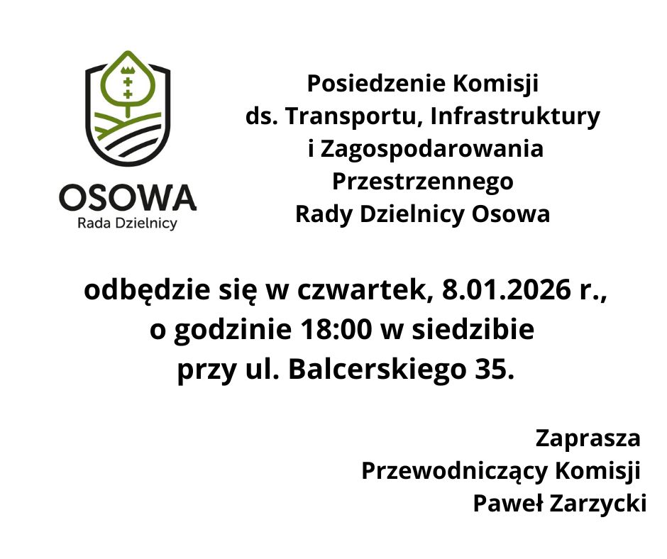 Przewodniczący Komisji ds. Transportu, Infrastruktury i Zagospodarowania Przestrzennego, Radny Paweł Zarzycki, zaprasza mieszkańców na posiedzenie prowadzonej przez siebie Komisji, które odbędzie się w najbliższy czwartek, 8 stycznia, od godziny 18:00 w naszej siedzibie przy ul. Balcerskiego 35 (na 1. piętrze)